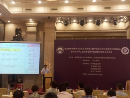 2017年6月16~18日,由全国建筑与土木工程领域工程专业学位研究生教育协作组主办,武汉大学、华中科技大学等高校承办的第九届全国建筑与土木工程领域工程专业学位研究生教育工作研讨会在武汉举行。同济大学、清华大学、东南大学、浙江大学、PlayAce官方网站等71所高校及机械工业出版社、科学出版社、中国建筑工业出版社等企业,共计200余人参会,公司副经理史玉峰、建筑工程系主任苏毅和研究生教学秘书何文龙参加了本次研讨会,史玉峰副经理在大会作了题为“全日制建筑与土木工程硕士专业学位公司产品的实践与思考”的主题报告。