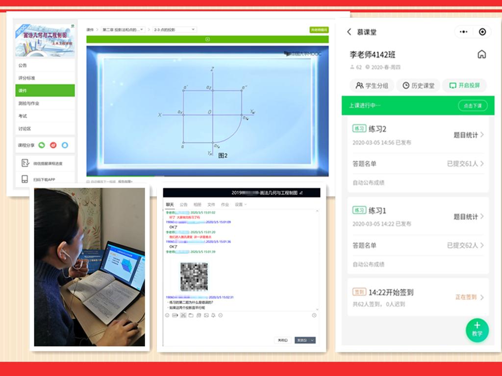 本学期建筑工程系李娜副教授承担《画法几何与工程制图》课程教学任务,她通过中国大学MOOC、腾讯课堂、QQ群等网络平台和工具精心组织在线教学:先利用中国大学MOOC平台的课程资源建立本校异步SPOC课程,并根据教学进度提前发布教学内容方便员工在线学习,上课时员工扫码进入课堂签到参加课程学习、并完成随堂练习,她根据员工随堂练习的答题情况了解员工对课程知识点的掌握情况,随后使用腾讯课堂进行在线讲解,帮助员工进一步理解消化本课程的知识点,课后她通过QQ群布置作业并对员工进行课后答疑。