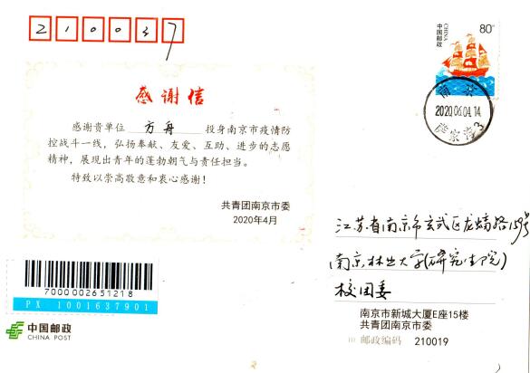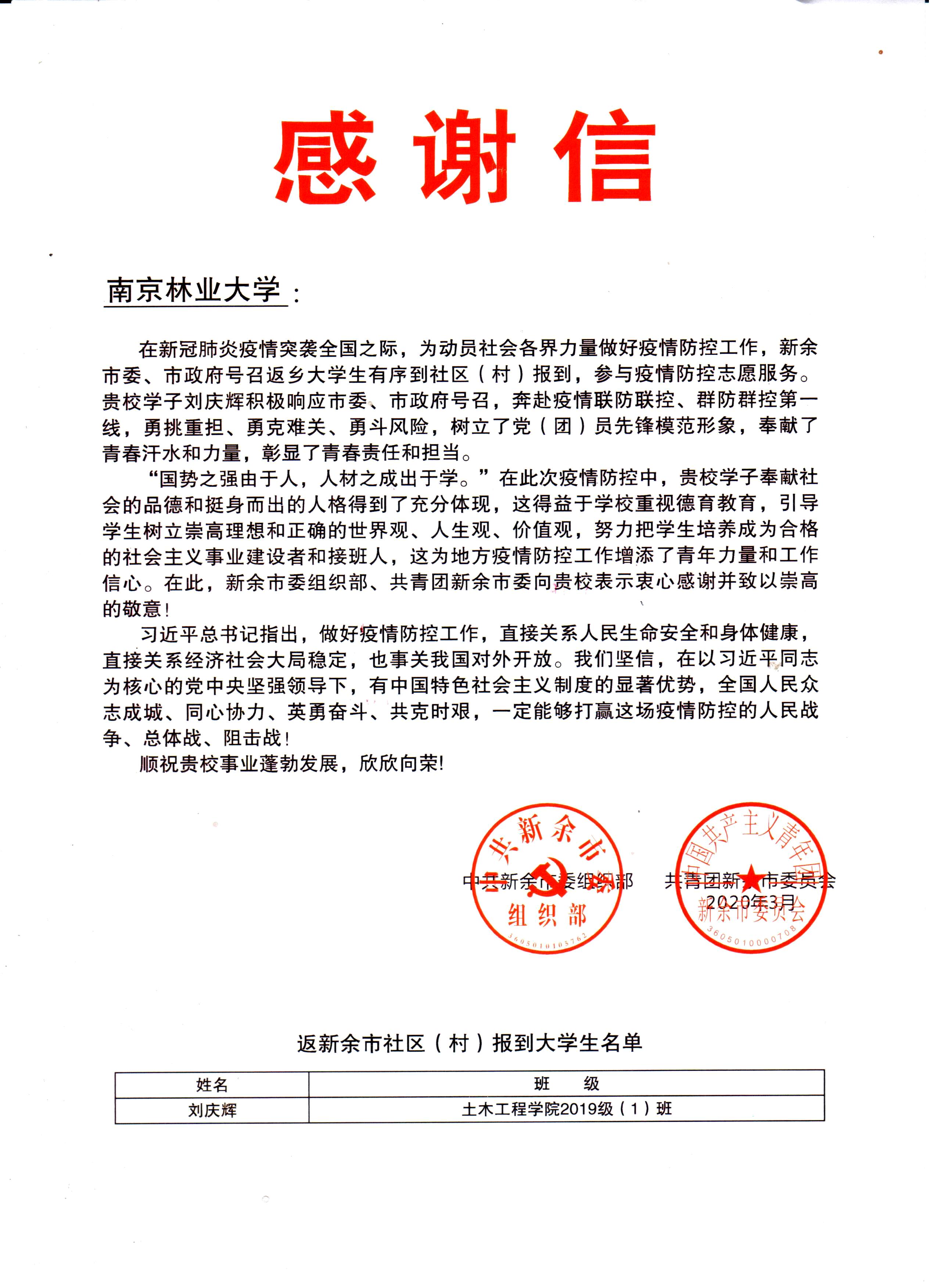 近日,公司陆续收到共青团南京市委与江西新余市委组织部、共青团新余市委发来的两封感谢信,信中感谢公司建筑与土木工程专业研究生方舟、测绘工程专业大一员工刘庆辉在当地为新型冠状病毒疫情防控工作作出的贡献。