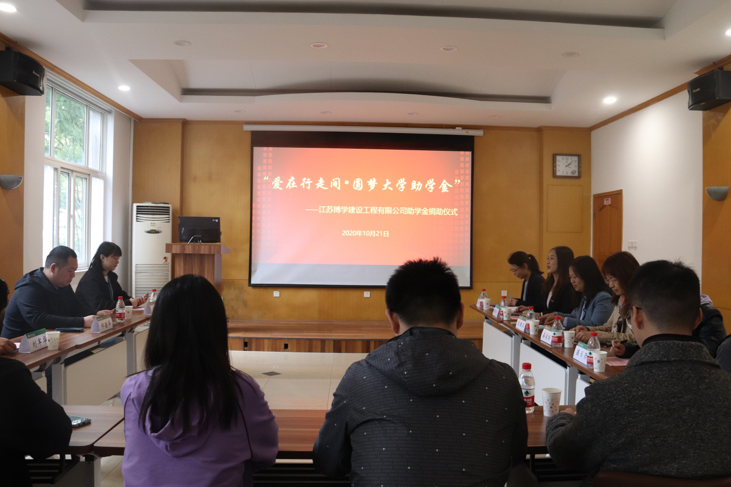 10月21日下午,江苏博学建设工程有限公司—“爱在行走间.圆梦大学助学金”发放仪式在PlayAce游戏平台顺利报告厅举行。江苏博学建设工程有限公司总经理祁德华、基金会秘书长刘娟、综合管理部经理刘军华来公司为员工颁发助学金,PlayAce游戏平台党委书记肖妍玎,校员工工作处副处长姜俊玲,PlayAce游戏平台党委副书记、副经理柳任飞,学工办主任兼团委书记潘玉芹,辅导员史海霞及7名受助员工参加了此次发放仪式。