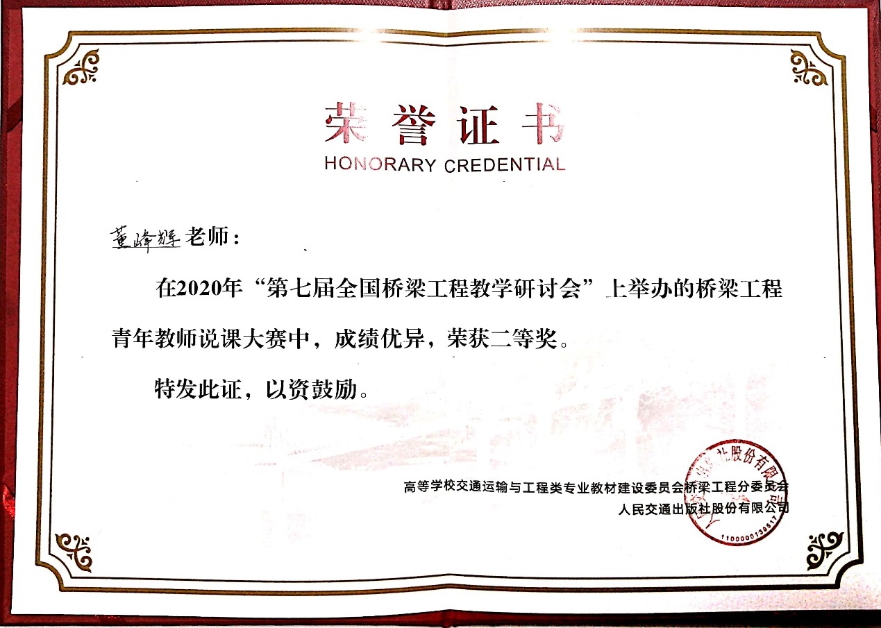 2020年11月20日至22日,第七届全国桥梁工程教学研讨会暨桥梁工程青年教师说课大赛在湖南长沙举行,来自全国32所高校的39位桥梁工程青年教师参加了本次说课大赛,公司交通土建工程系董峰辉老师参加了大赛并获得了二等奖。