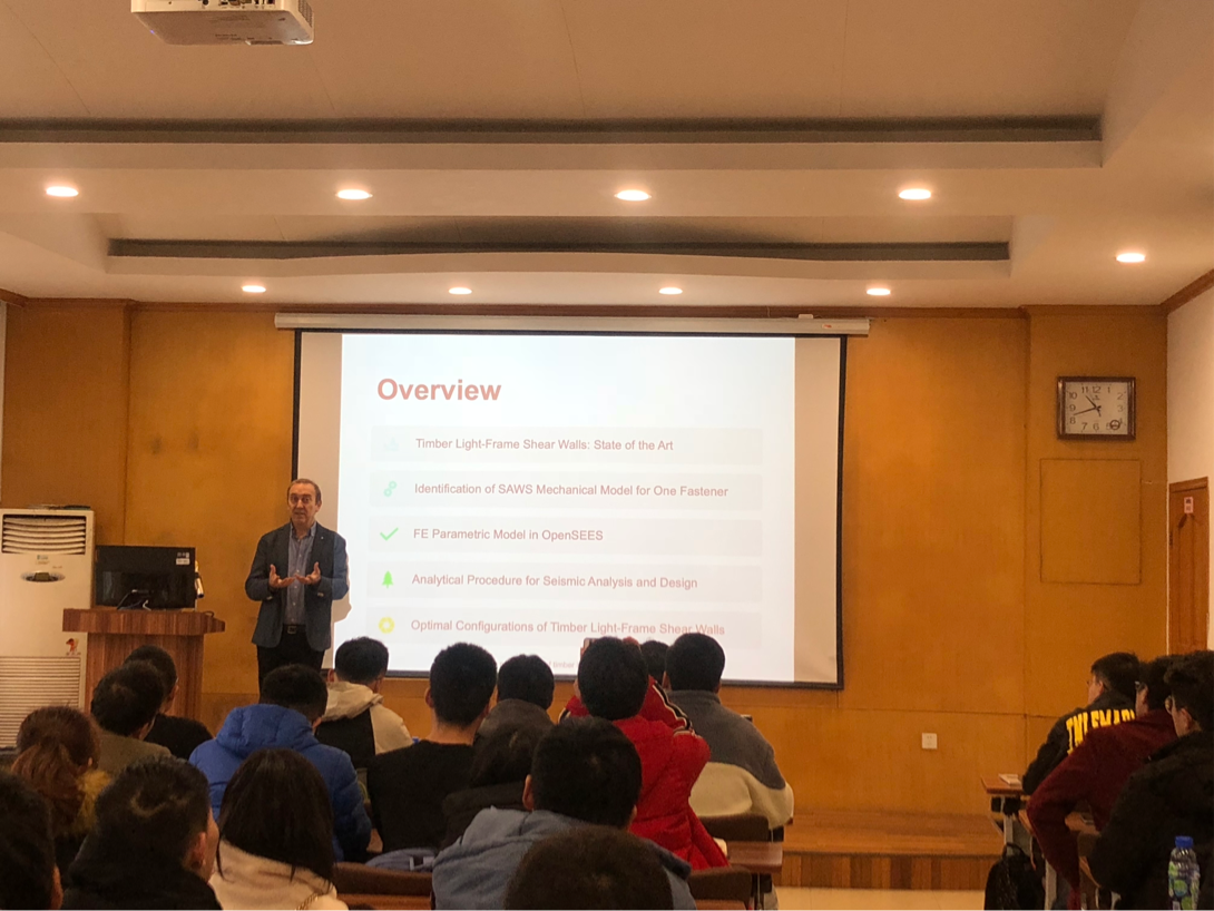 Giorgio Monti教授基于已有的试验结果,综合考虑多种参数的影响,采用数值分析方法,围绕轻型木剪力墙的力学性能进行了系统的研究与分析,给出了相关承载力计算公式和设计建议。报告结束,参加讲座的老师和同学们同Giorgio Monti教授就报告主题进行了热烈的讨论,报告在热烈的掌声中结束。