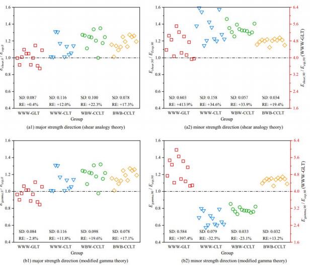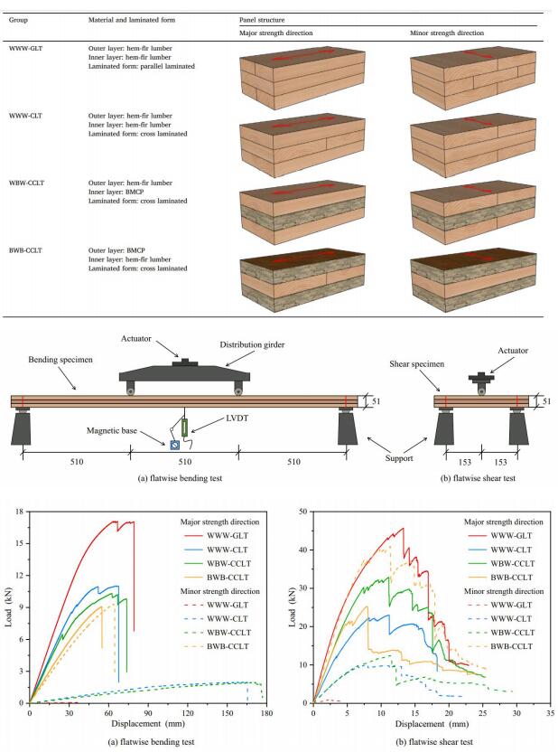 全球各地都在尝试使用当本土树种进行正交胶合木(CLT)的工业化生产。在竹材资源丰富而木材资源相对匮乏的地区,利用竹质和木质复合材料生产复合CLT具有广阔的前景。此项工作研究了两种由竹帘/竹席胶合板和铁-冷杉锯材构成的新型的3层复合CLT面板结构。通过面外加载形式下的弯曲与剪切试验,对两种复合CLT在主强度方向和次强度方向的力学性能展开了系统的研究。此外,根据剪切类比理论和修正伽马理论计算了板结构的有效弹性模量,并与实测弹性模量进行了比较。基于剪切类比理论,探究了板层厚度对板层弹性模量的影响。结果表明:与其他类型的复合CLT不同,该类新型复合CLT具有更为显著的双向力学性能特点。通过改变复合CLT的面板结构,使得一个强度方向的力学性能降低,另一个强度方向的力学性能则会因为板层特性而相应的增大。本次工作是与宁波中加低碳技术研究有限公司王建和院士联合开展的研究的一部分,研究结果对今后竹木复合CLT板面结构设计和优化具有一定的指导意义。