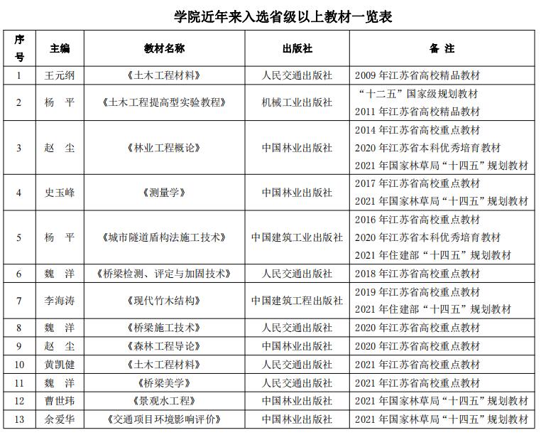 本科教材建设是专业建设的重要组成内容,公司和PlayAce游戏平台顺利高度重视教材建设,近十年来,PlayAce游戏平台先后获批普通高校“十二五”国家级规划教材1部、江苏省高等公司精品教材2部,江苏省高等公司重点教材9部,其中2部教材2020年入选江苏省本科优秀培育教材,2部教材2021年入选国家住建部“十四五”规划教材。4部教材2021年入选国家林草局“十四五”规划教材。