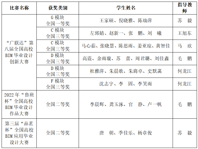 今年5月份,公司学子在“广联达”全国高校BIM毕业设计创新大赛、“鲁班杯”全国高校BIM毕业设计作品大赛、“品茗杯”全国高校BIM应用毕业设计大赛等多项BIM毕业设计大赛中捷报频传,累计荣获全国一等奖1项、二等奖2项、三等奖5项。