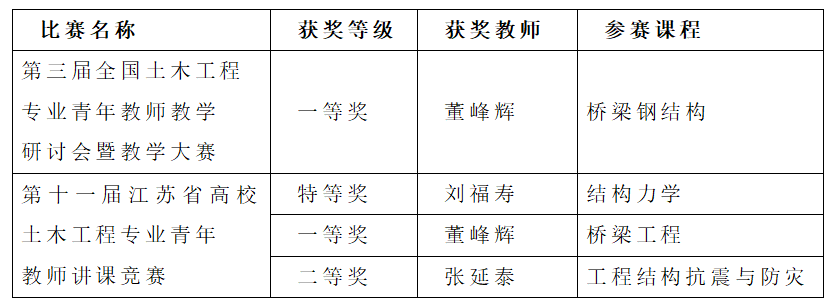 2022年8月,PlayAce游戏平台选派优秀青年教师参加了第三届全国土木工程专业青年教师教学研讨会暨教学大赛和第十一届江苏省高校土木工程专业青年教师讲课竞赛,并喜获佳绩:获得全国一等奖、省特等奖、省一等奖、省二等奖各1项。