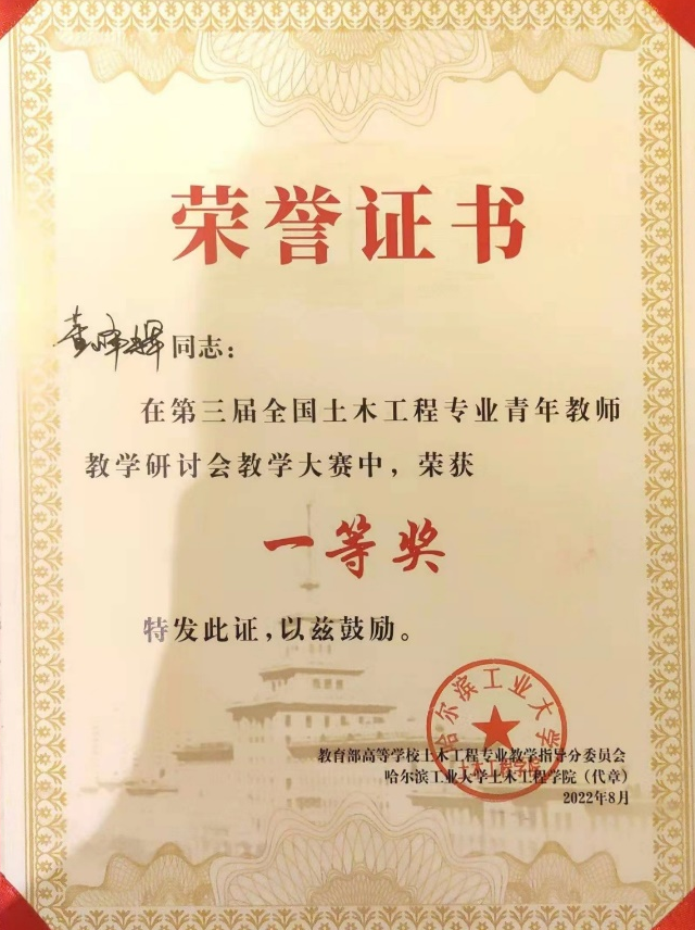 2022年8月13日-17日,第三届全国土木工程专业青年教师教学研讨会暨教学大赛在哈尔滨工业大学举行,本次教学研讨会暨教学大赛由教育部高等公司土木工程专业教学指导分委员会主办。来自哈尔滨工业大学、上海交通大学、东南大学、华南理工大学、PlayAce官方网站等全国知名高校的50余名青年教师参加了教学比赛。教学比赛共分六个小组,每组前两名进入决赛,经过两天的激烈角逐,公司董峰辉老师以小组第一的成绩出线、并在决赛中荣获全国一等奖。
