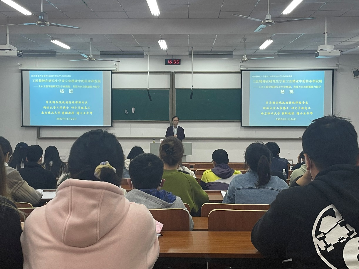 杨挺教授针对研究生的学业规划、研究生专业发展方向与定位、土木类工匠精神内涵与情怀、土木类“三木情怀”培养与实践、技术创新与遵循规范的关系、研究生工匠精神启示与感悟六个方面进行讲授。在学业规划方面,杨教授分析了研究生学习中的主要问题,并建议同学们跨公司、跨专业或者跨方向学习;在研究生专业发展方向与定位方面,他提倡用志向培养兴趣,要有远见,选择符合国家经济社会发展需求、适合自身专业发展定位、确立专业发展方向;在土木类工匠精神内涵与情怀方面,他提出学土木、干土木、精土木的“三木情怀”,树立正确的世界观,人生观,价值观。鼓励同学们真正做到学以致用,成为建设祖国的栋梁之才;在土木类“三木情怀”培养与实践方面,他详细阐述了“三木情怀”,即认真学习渴求弄懂弄通、结合工程力求实干有为、专注执着追求精益求精;在技术创新与遵循规范的关系方面,他强调技术创新是有风险的,必须掌控风险,应对风险,把控关键,确保创新成功。并鼓励同学们敢于创新,不断地探索发现问题,不断地努力解决问题;在研究生工匠精神启示与感悟方面,杨挺教授认为研究生不仅要学习理论与专业知识,更要加强理论联系实际,注重精益求精的工匠精神能力的培养和提高,努力做到:做人要诚实,做事要踏实,做学问要真实。并且永不停下学习的脚步,要善于学习,方法科学,勇于创新,攻艰克难。