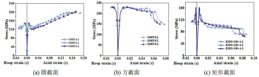 不锈钢管UHPC柱显示出了高效的轴压性能,不锈钢管的约束有效缓解了UHPC的承压脆性破坏,稳定了UHPC的残余承载力;圆形不锈钢管UHPC短柱具有明显的应力硬化,方形和矩形不锈钢管UHPC短柱的应力传递平稳;相较于碳素钢管UHPC短柱,不锈钢管UHPC短柱的峰后延性明显提高,具备高效的承压稳定性。系列研究成果为不锈钢管UHPC柱结构领域的计算分析提供了一定的理论基础,为其实际工程应用提供了有价值的理论参考。