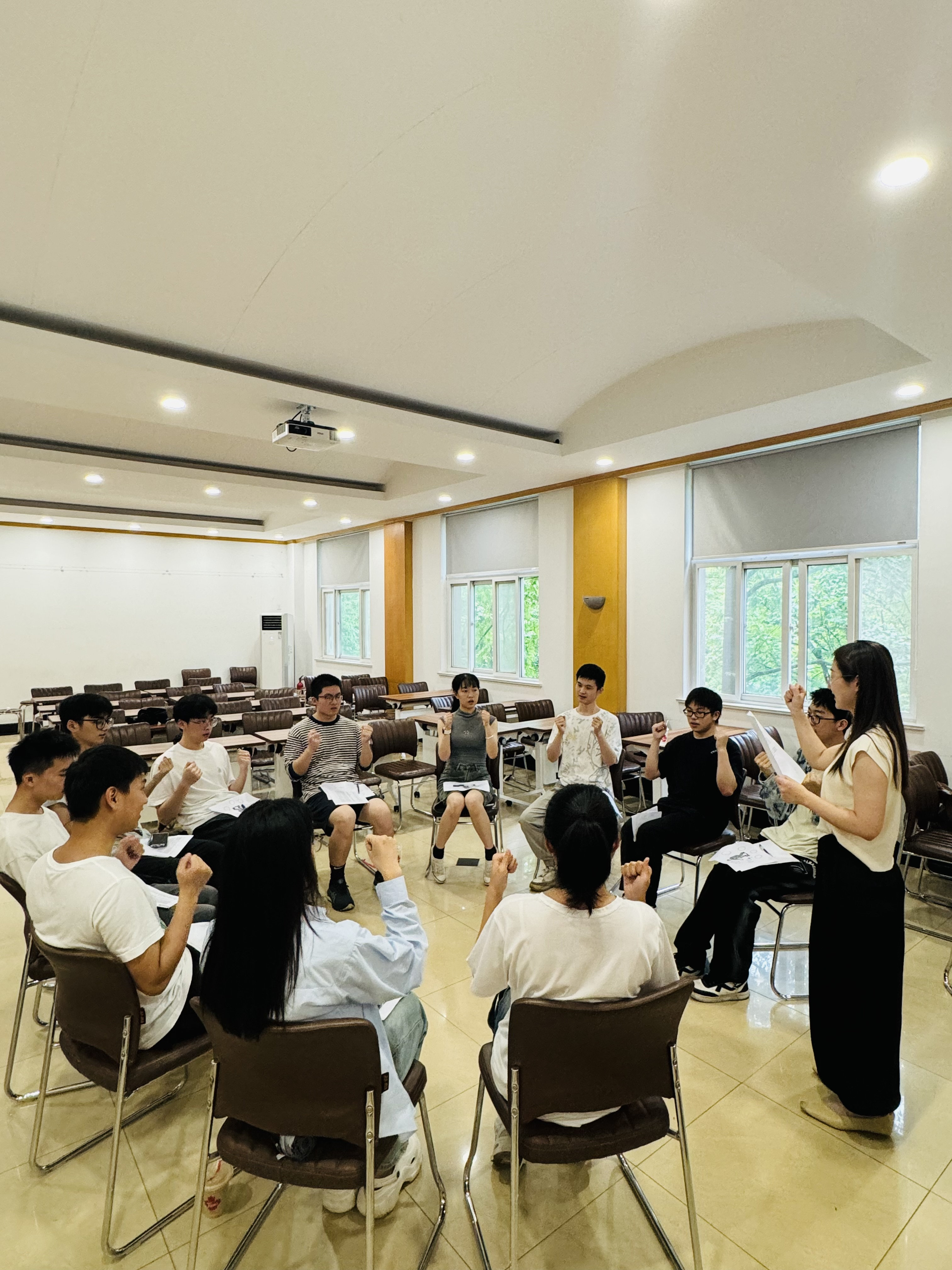 活动伊始,滕老师向参与团辅的成员介绍了活动规则,并通过一套手动操来缓解大家因不熟悉彼此而产生的紧张感。成员们随着口令不断摇动手臂、挥动手掌。几轮下来,大家都放松了许多,慢慢适应了团辅的形式。