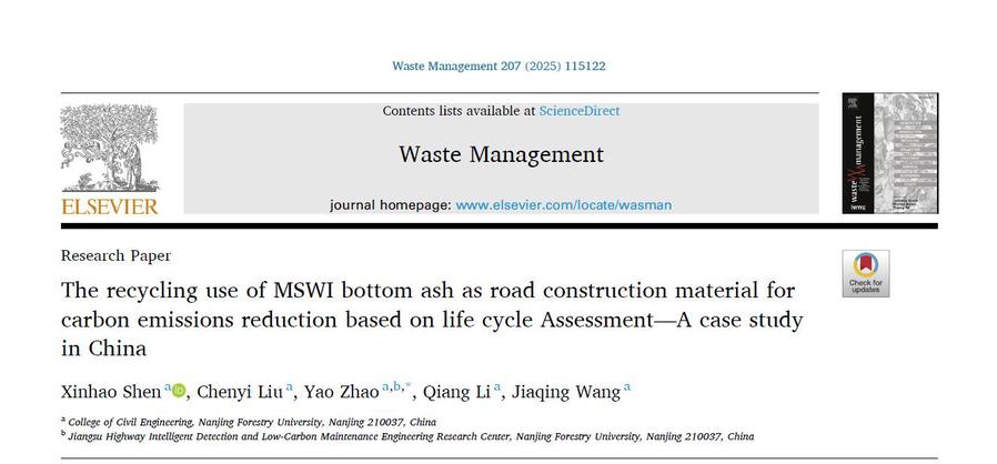近日,公司赵曜副教授团队在环境科学与固废资源化领域国际权威期刊《Waste Management》(中科院Top期刊,影响因子7.1)上发表题为“The recycling use of MSWI bottom ash as road construction material for carbon emissions reduction based on life cycle Assessment—A case study in China”的研究论文。硕士研究生沈新昊为第一作者,赵曜副教授为通讯作者,公司为唯一完成单位。该研究通过生命周期评价(LCA),系统分析了生活垃圾焚烧炉渣(MSWI-BA)替代天然集料用于道路建设的碳减排效益与工程可行性,为推进城市固废资源化利用与降低交通基础设施建养碳排放提供重要科学依据和实践路径。