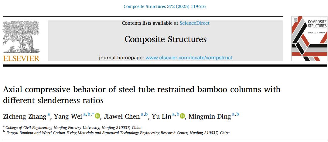 近日,公司魏洋教授课题组在复合材料与力学领域顶级期刊《Composite Structures》(JCR 1区;影响因子:7.1)上发表了重要研究成果(Axial compressive behavior of steel tube restrained bamboo columns with different slenderness ratios)。PlayAce官方网站为第一完成单位,魏洋教授为通讯作者,博士生张子诚为第一作者。成果获得了国家自然科学基金项目、江苏省自然科学基金项目等资助。